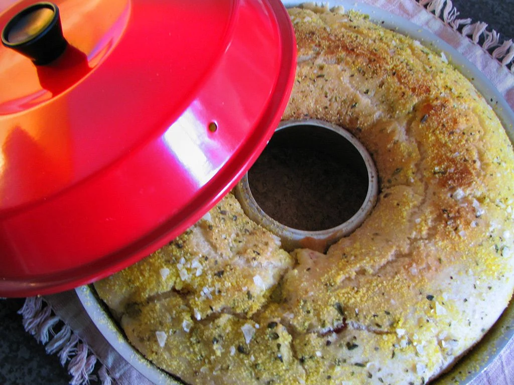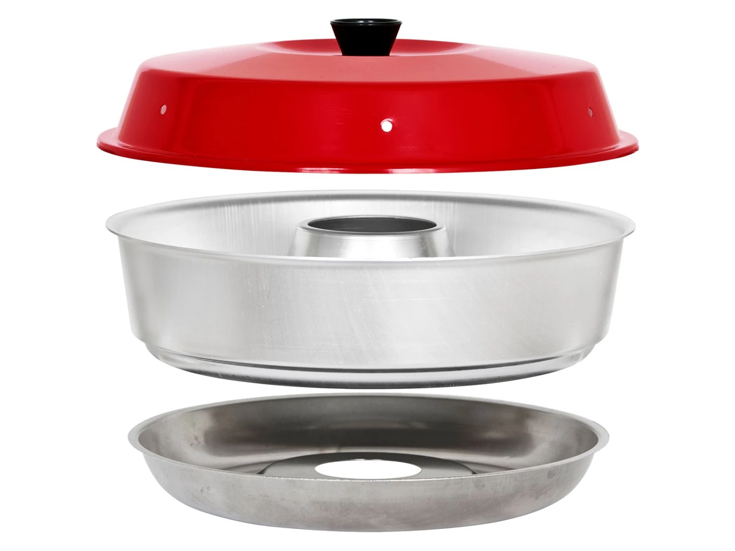 De pan bestaat uit 3 delen, een roestvrij stalen onderstel, een aluminium bakvorm en een rood afgelakte deksel met kleine stoomopeningen. Deze onderdelen worden altijd samen gebruikt en zorgen voor een onder- en boven warmte, net zoals bij een gewone oven.